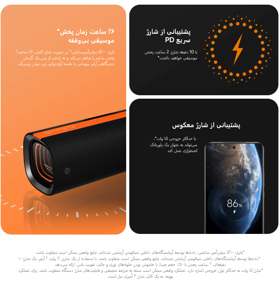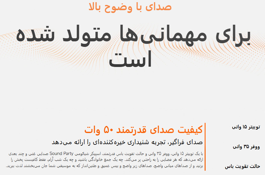 ترکیب سختافزار صوتی قوی و فناوریهای بهروز باعث شده Sound Party صدایی شفاف، متعادل و پرقدرت ارائه دهد. این ترکیب، تفکیک فرکانسهای بالا و پایین را به خوبی انجام میدهد و پوشش صدای کامل را تضمین میکند. در این اسپیکر حالت Bass Boost باس عمیقتری ایجاد میکند و Harman AudioEFX تعادل صدای کلی را بهبود میبخشد.