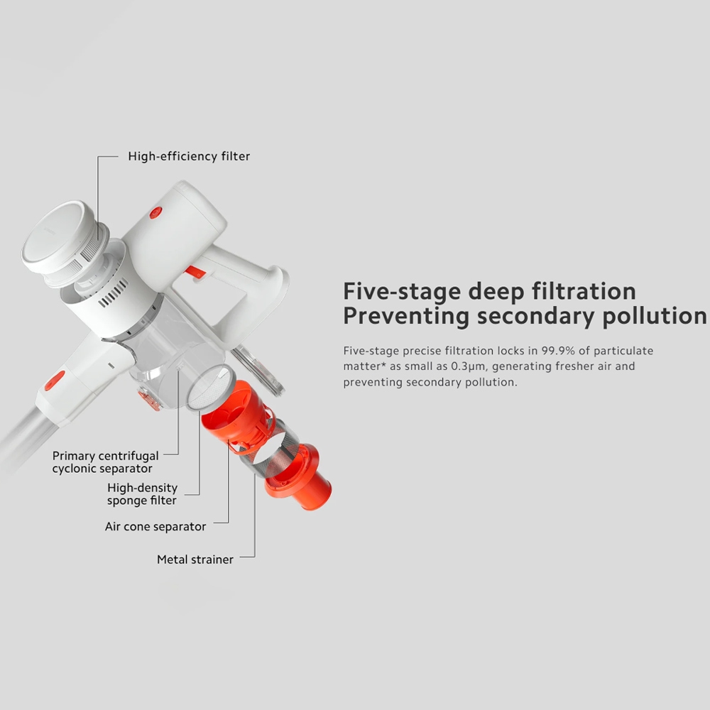 جارو شارژی عصایی شیائومی مدل Xiaomi Vacuum Cleaner G20 Lite دارای یک سیستم پیشرفته فیلتراسیون است که به منظور جلوگیری از آلودگی ثانویه و تولید هوای تازه‌ تر طراحی شده است. این سیستم فیلتراسیون دقیق پنج مرحله ‌ای قادر است ۹۹.۹٪ از ذرات معلق به اندازه ۰.۳ میکرو متر را حبس کند. این مراحل عبارتند از: