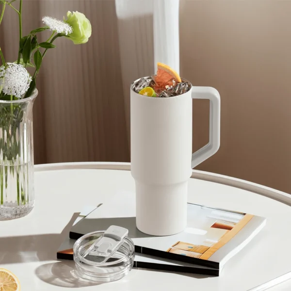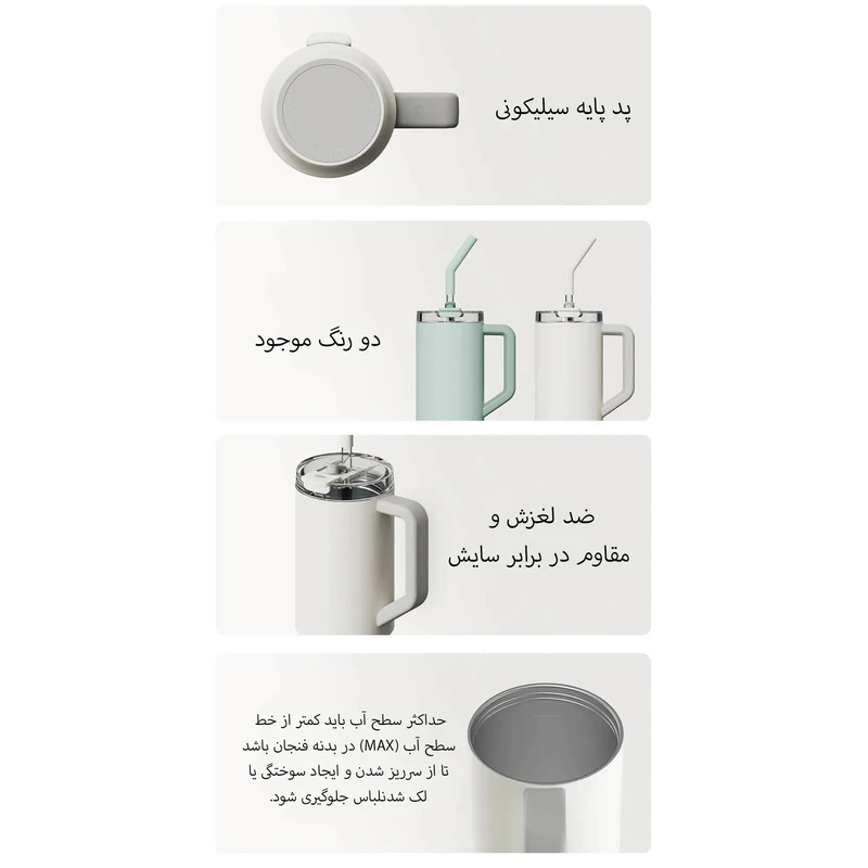 این ماگ دارای دهانهای عریض به قطر 9 سانتیمتر است که نه تنها به آسانی برای تهیه و تمیز کردن نوشیدنی کمک میکند، بلکه امکان استفاده از نی سیلیکونی را فراهم کرده است. نی سیلیکونی بهکار رفته در این ماگ، دارای ساختار نرم و لطیف است. همچنین، جنس نی و درب از مواد Tritan سازگار با محیط زیست تولید شدهاند که از ایمنی و سلامت مصرفکننده اطمینان حاصل میکند.