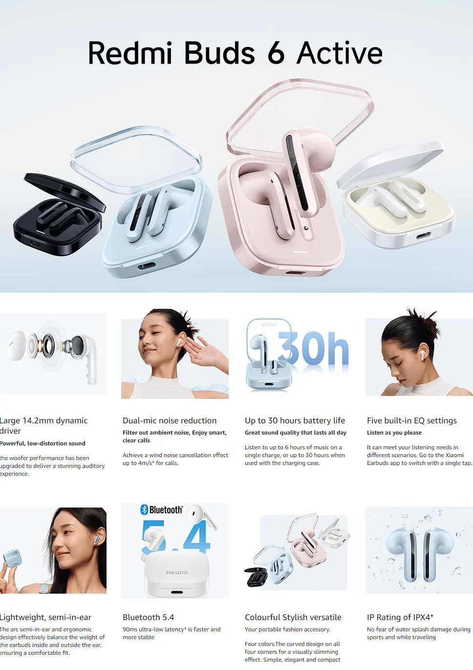 مقاومت در برابر آب و گرد و غبار: یکی دیگر از ویژگیهای مهم Redmi Buds 6 Active، مقاومت آن در برابر آب و گرد و غبار با استاندارد IPX4 است. این ویژگی باعث میشود که بتوانید از این هندزفری در شرایط مختلفی مانند ورزش یا پیادهروی در زیر باران استفاده کنید بدون اینکه نگرانی از آسیب دیدن آن داشته باشید.