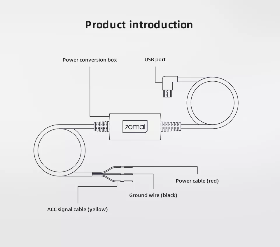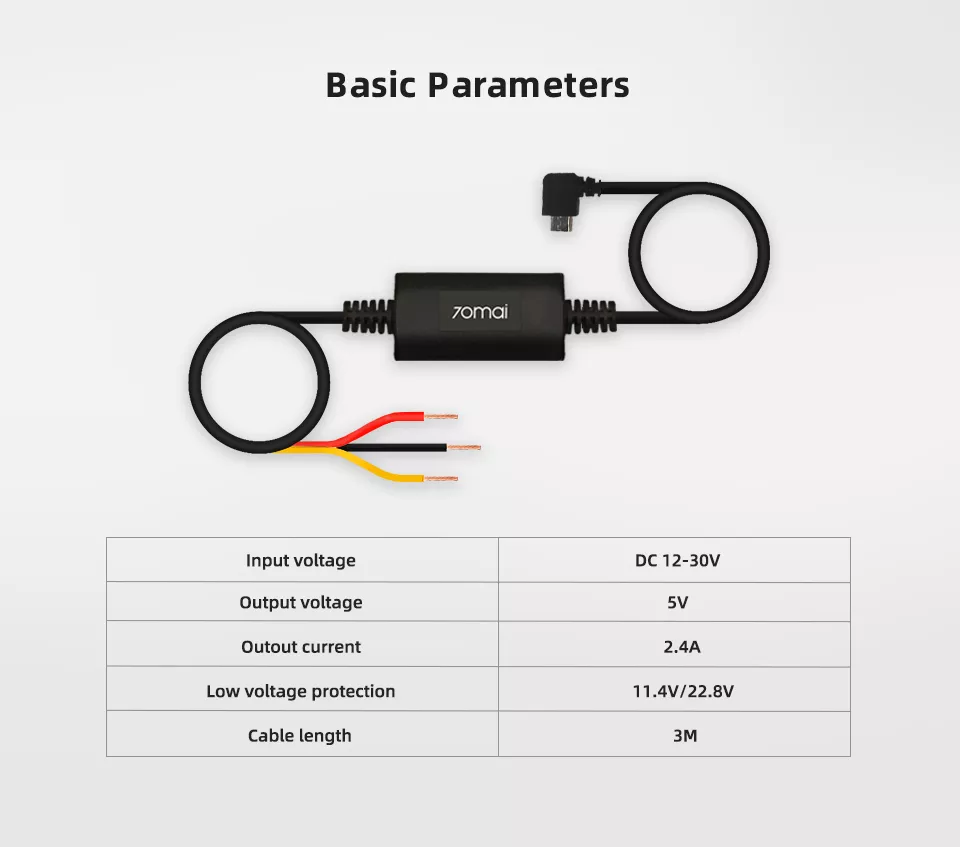 سیم ۳ متری کیت را می‌توان روی همه وسایل نقلیه نصب کرد. نیازی نیست نگران کمبود طول کابل باشید. همچنین این کیت به طور گسترده با دوربین‌های دشکم 70mai از جمله A800s/A500s/A400/M300/Lite(D08)/s500 سازگار است.